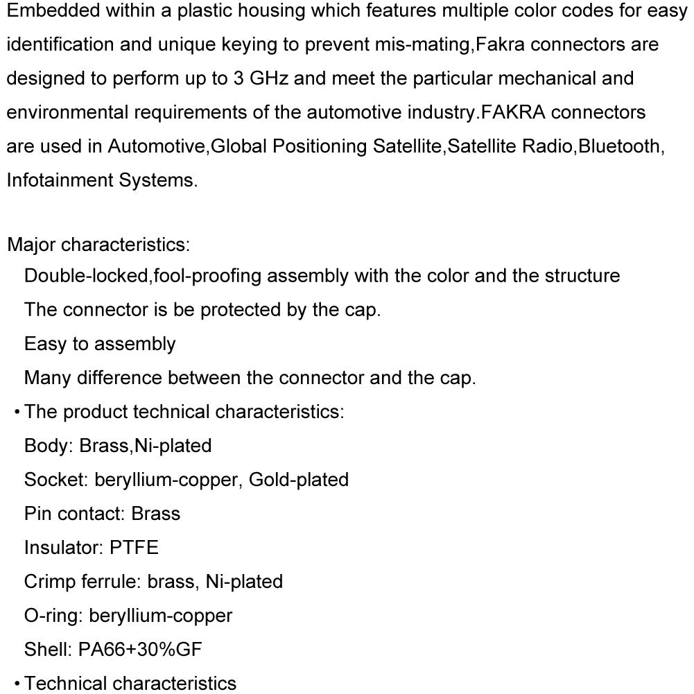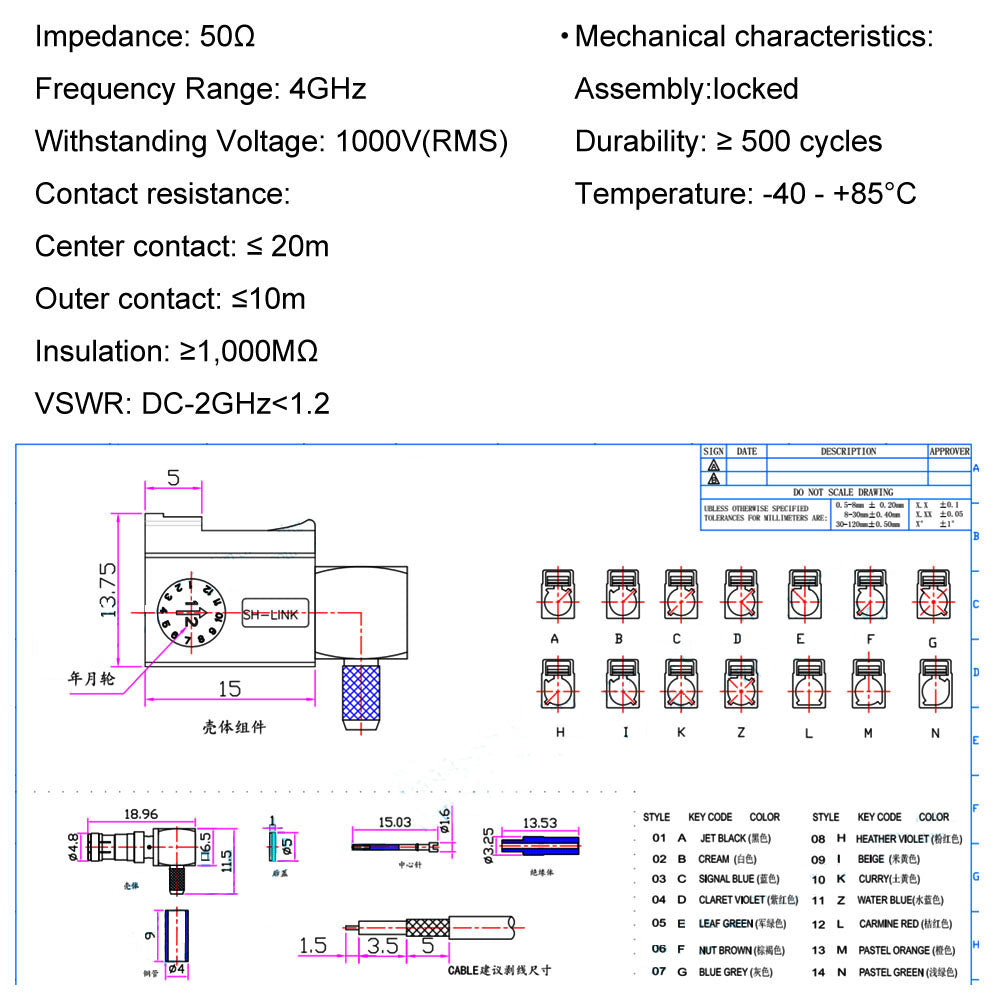 Major characteristics: - Double-locked, fool-proofing assembly with the color and the structure - The connector is be protected by the cap. - Easy to assembly - Many difference between the connector and the cap. • The product technical characteristics: - Body: Brass, Ni-plated - Socket: beryllium-copper, Gold-plated - Pin contact: Brass - Insulator: PTFE - Crimp ferrule: brass, Ni-plated - O-ring: beryllium-copper - Shell: PA66+30%GF • Technical characteristics - Impedance: 50Ω - Frequency Range: 4GHz - Withstanding Voltage: 1000V(RMS) - Contact resistance: - Center contact: ≤ 20m - Outer contact: ≤10m - Insulation: ≥1,000MΩ - VSWR: DC-2GHz<1.2 • Mechanical characteristics: - Assembly: locked - Durability: ≥ 500 cycles - Temperature: -40 - +85°C