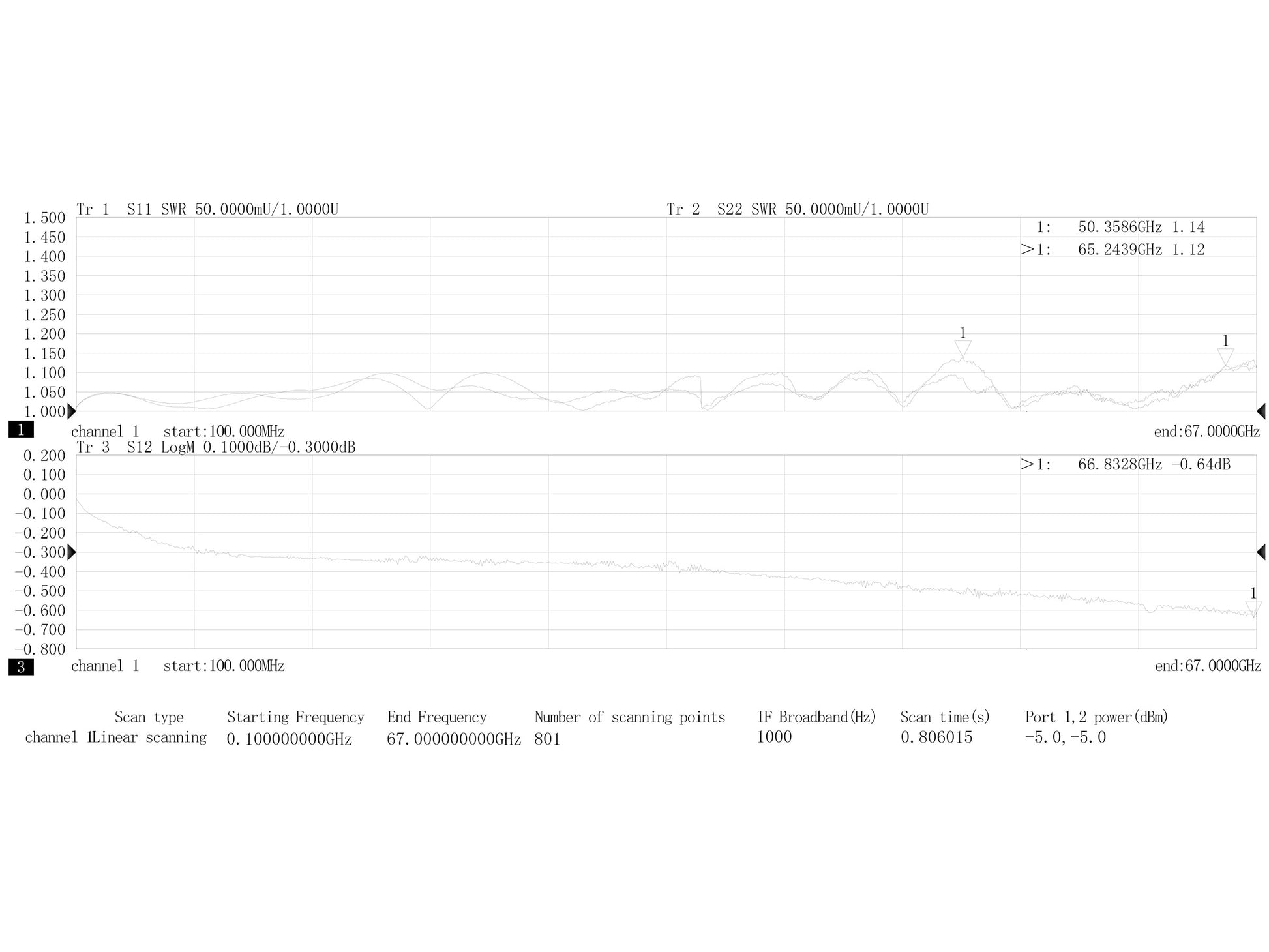 - 1.0 mm Female to 1.85 mm Male type Adapter; Material : Body :Stainless Steel(Passivated,High-frequency millimeter-wave test connectors made of stainless steel), Pin : Berylllium Copper(Gold plated), Impedance : 50 Ohm, Frequency: DC to 67 GHz, VSWR : 1:1.2