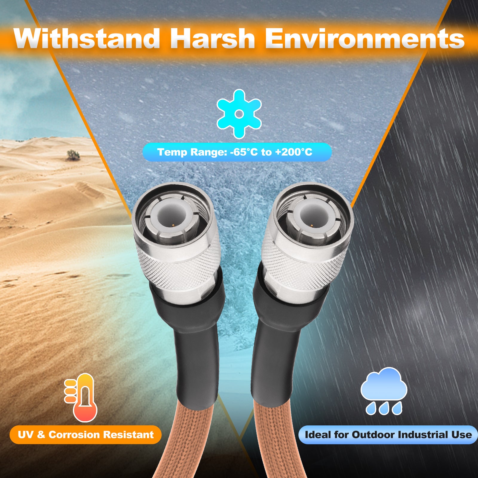 - Pre-assembled HN-J Male to Male Cable: Factory pre-assembled 50 Ohm RG393 coaxial jumper saves field welding complexity and time, ensuring consistent connection stability and immediate plug-and-play use in RF test benches and equipment