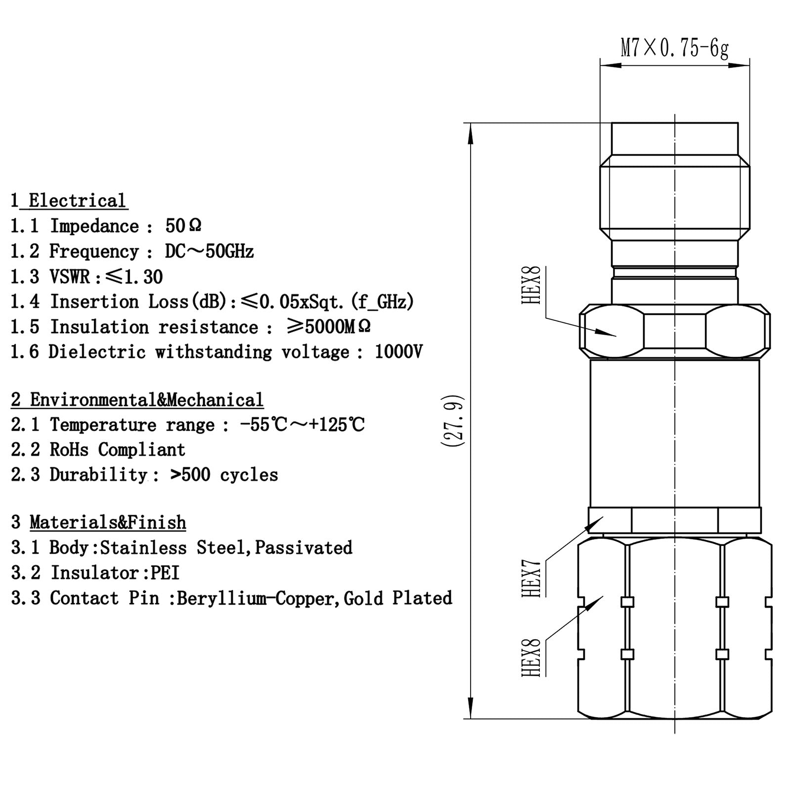 - 2.4 mm Male to 2.4 mm Female type Adapter; Material : Body :Stainless Steel(Passivated,High-frequency millimeter-wave test connectors made of stainless steel), Pin : Berylllium Copper(Gold plated), Impedance : 50 Ohm, Frequency: DC to 50 GHz, VSWR : 1:1.3
