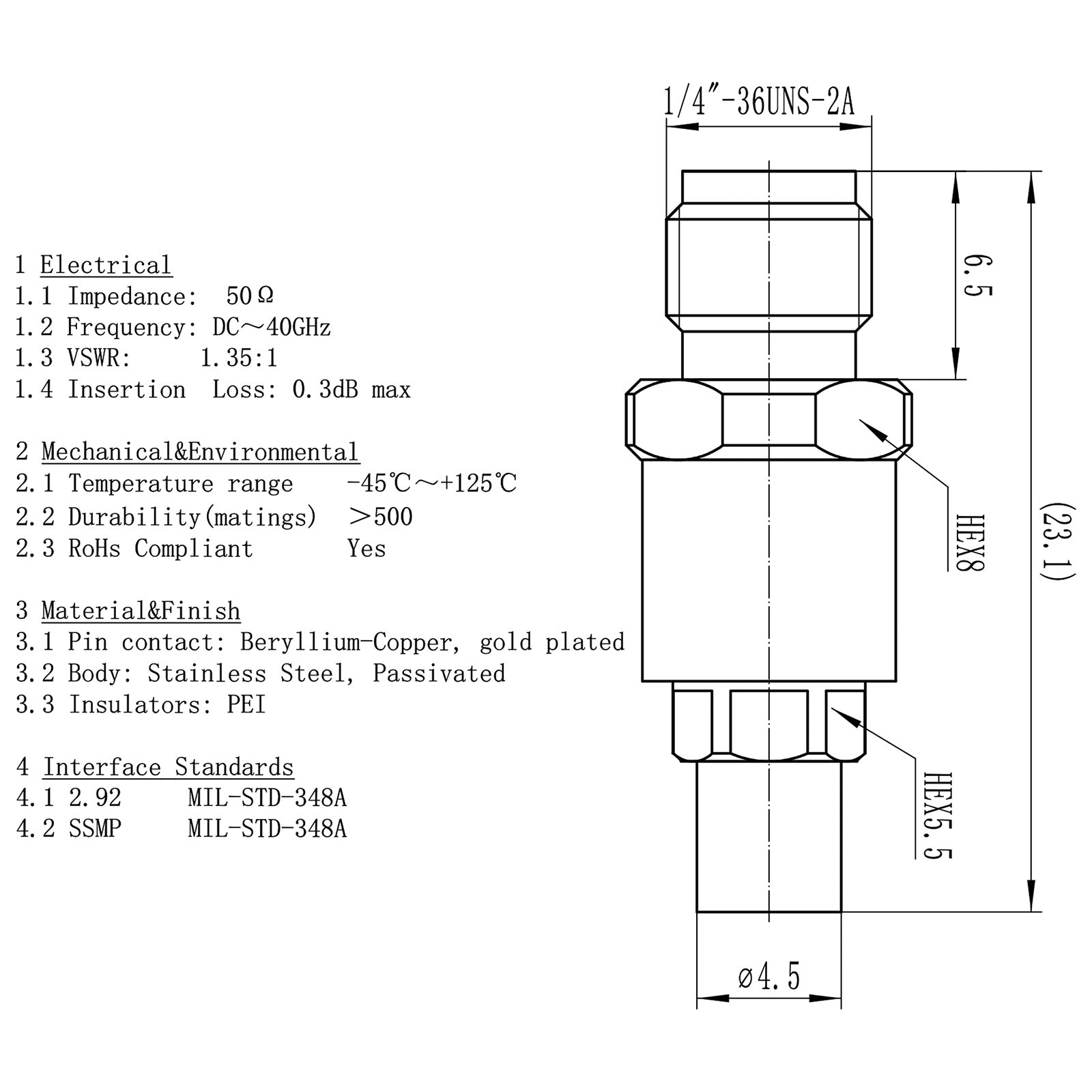 - 2.92 mm Female to SSMP Male type Adapter; Material : Body :Stainless Steel(Passivated,High-frequency millimeter-wave test connectors made of stainless steel), Pin : Berylllium Copper(Gold plated), Impedance : 50 Ohm, Frequency: DC to 40 GHz, VSWR : 1:1.2