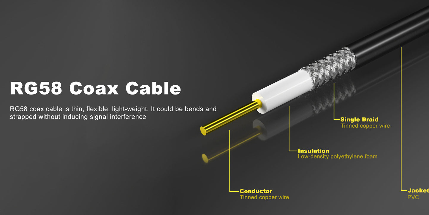 - Firm Connected - RG58 offers a significantly larger center conductor and supports better signal retention for longer cable runs and higher frequency use.our tube will not easy to fall off from the cable. And that can provide a heavy duty and firmly connection, really durable and professional coaxial cable