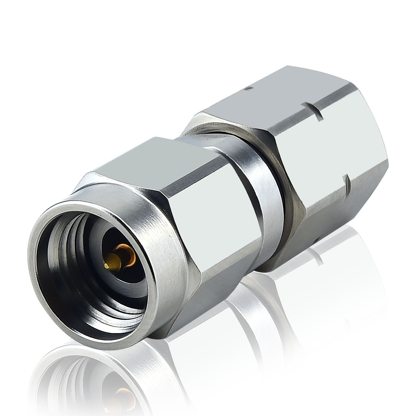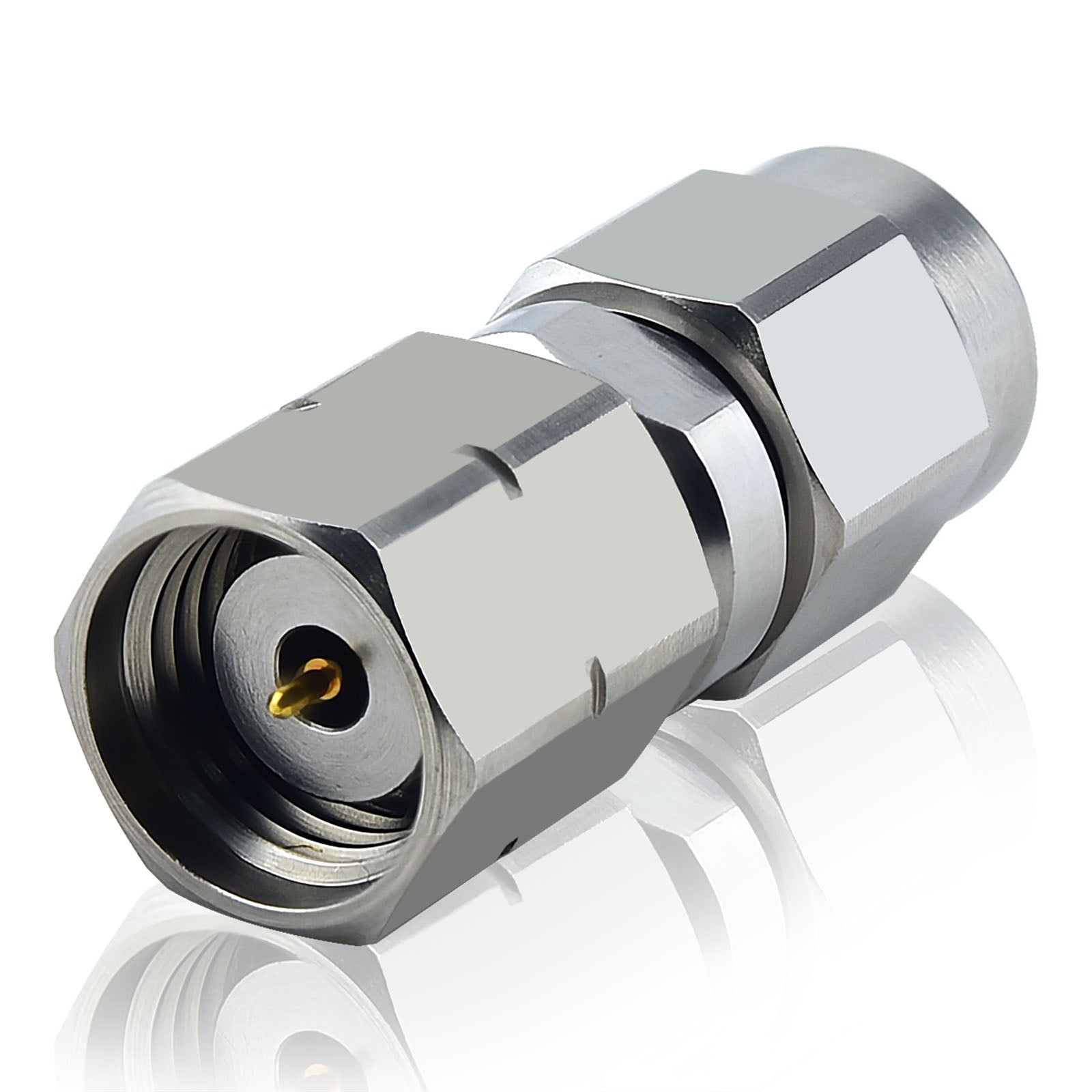 - 1.85 mm Male to 2.4 mm Male type Adapter; Material : Body :Stainless Steel(Passivated,High-frequency millimeter-wave test connectors made of stainless steel), Pin : Berylllium Copper(Gold plated), Impedance : 50 Ohm, Frequency: DC to 50 GHz, VSWR : 1:1.25