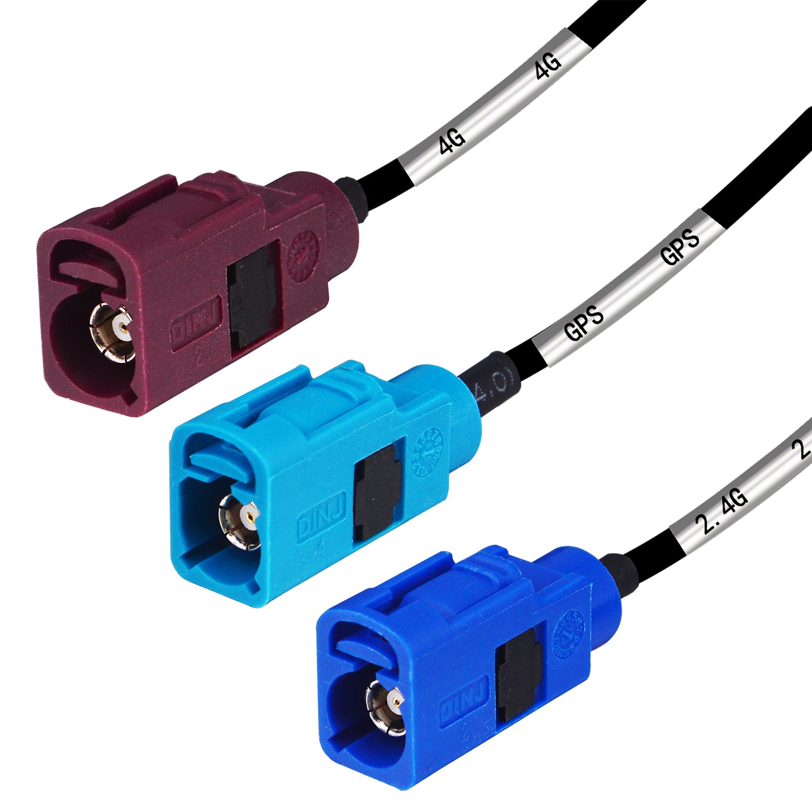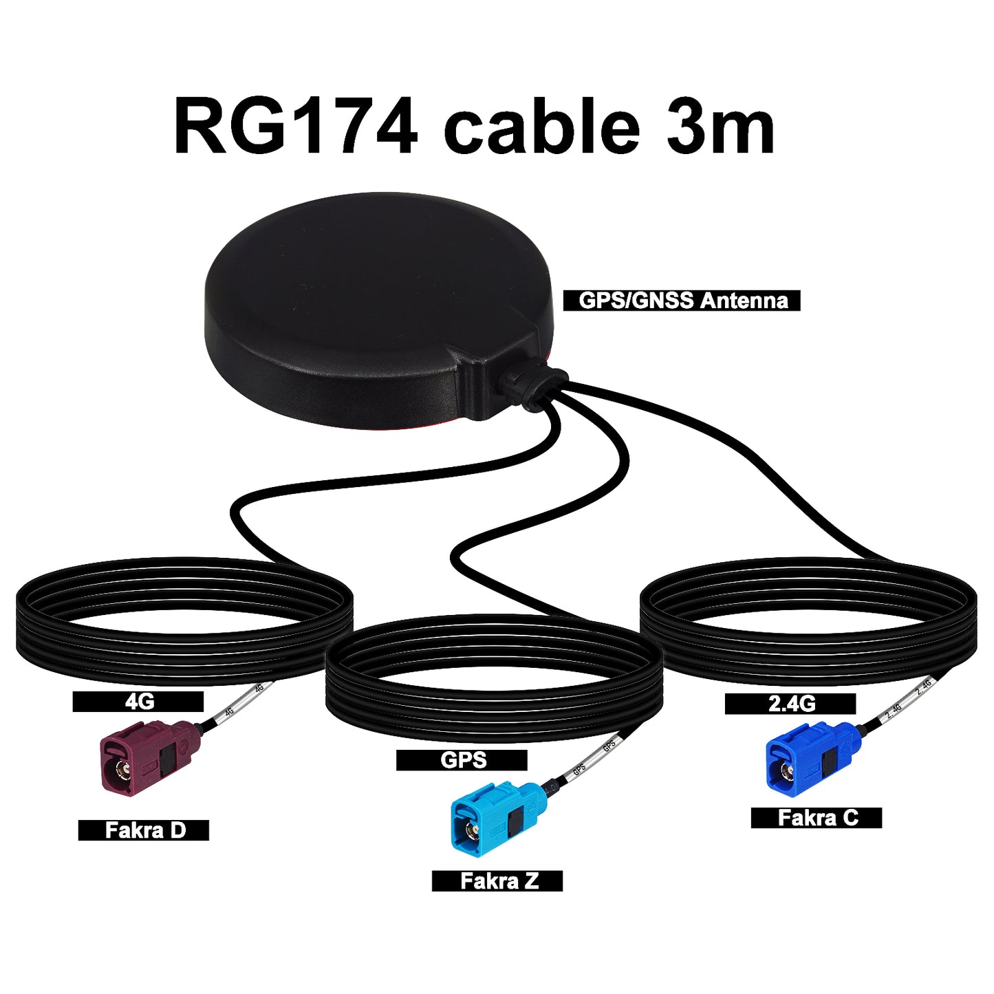 - The combo antenna comes with Blue FAKRA Type C for 2.4G antenna and Claret Violet Fakra Type D for 4G antenna,Water Blue FAKRA Type Z for GPS antenna. Three leads with 3 meters length for all your vehicular applications.