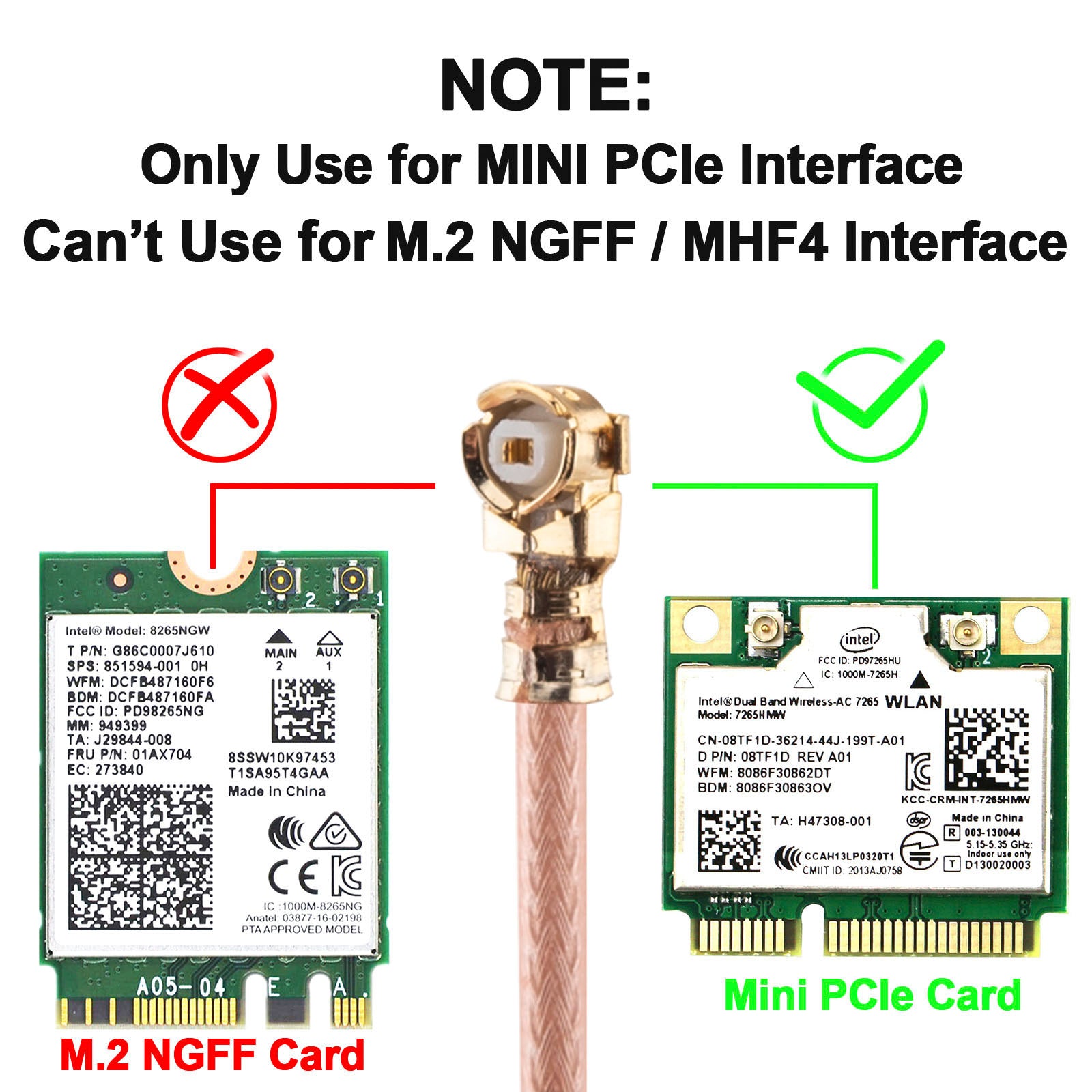 - Package Content - 5 X U.FL to SMA Female Right Angle Pigtail Antenna Wi-Fi Coaxial Low Loss RG178 Cable; COMPATIBILITY ALERT: Designed exclusively for Mini PCI-E interface cards. Please note: This is the larger U.FL type connector and is NOT compatible with newer M.2 NGFF cards.